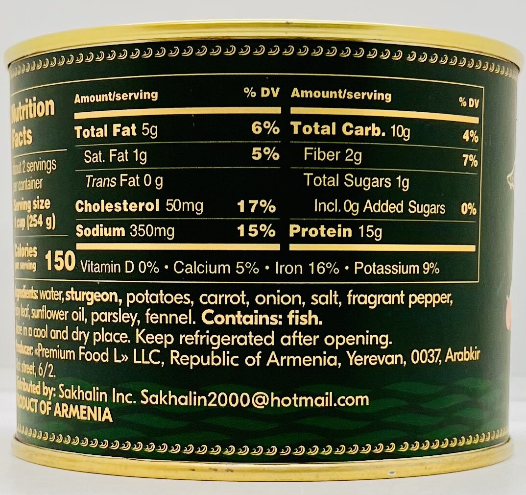 Water, sturgeon, potatoes, carrot, onion, salt, fragrant pepper, bay leaf, sunflower oil, parsley, fennel.