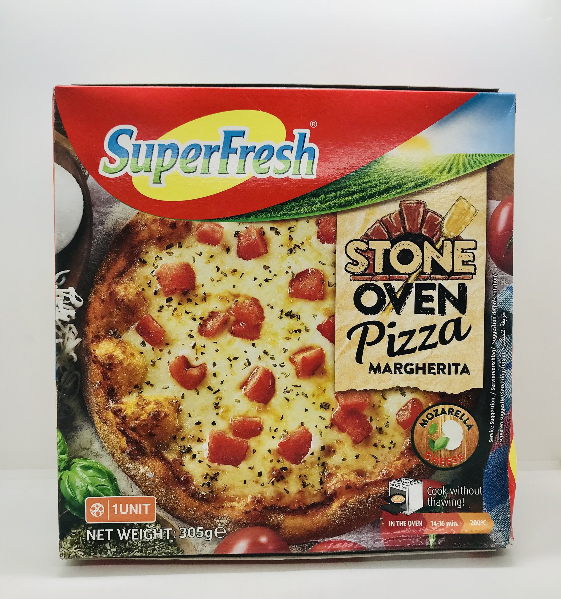 Wheat flour, water, mozarella cheese (21,3% ) [pasteurized cow's milk, salt, cheese culture, cheese yeast, preservative (potassium sorbate)], tomato (5,6%), tomato paste, vegetable oil (sunflower), yeast, sugar, salt, wheat gluten, spice mixture (irradiated), raising agents (sodium hydrogen carbonate, disodium diphosphate), anticaking agent (calcium carbonate), malted wheat flour, emulsifier (mono and diacetyl tartaric acid esters of mono and diglycerides of fatty acids), thickener (xanthan gum), antioxidant (ascorbic acid).