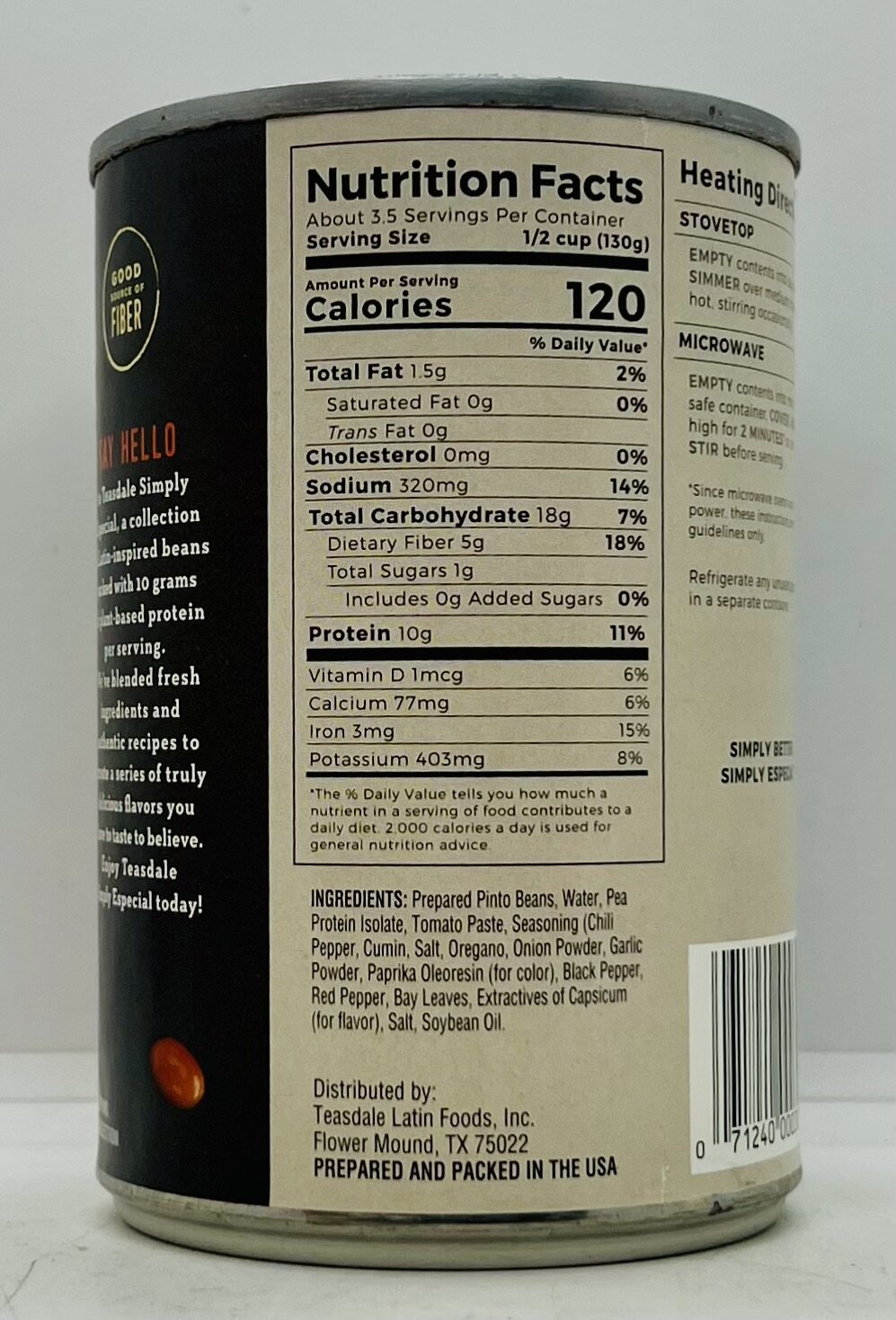 Prepared pinto beans, water, pea, protein isolate, tomato paste, seasoning (chili pepper, cumin, salt, oregano, onion powder, garlic powder, paprika oleoresin (for color), black pepper, red pepper, bay leaves, extractives of capsicum (for flavor), salt, soybean oil.