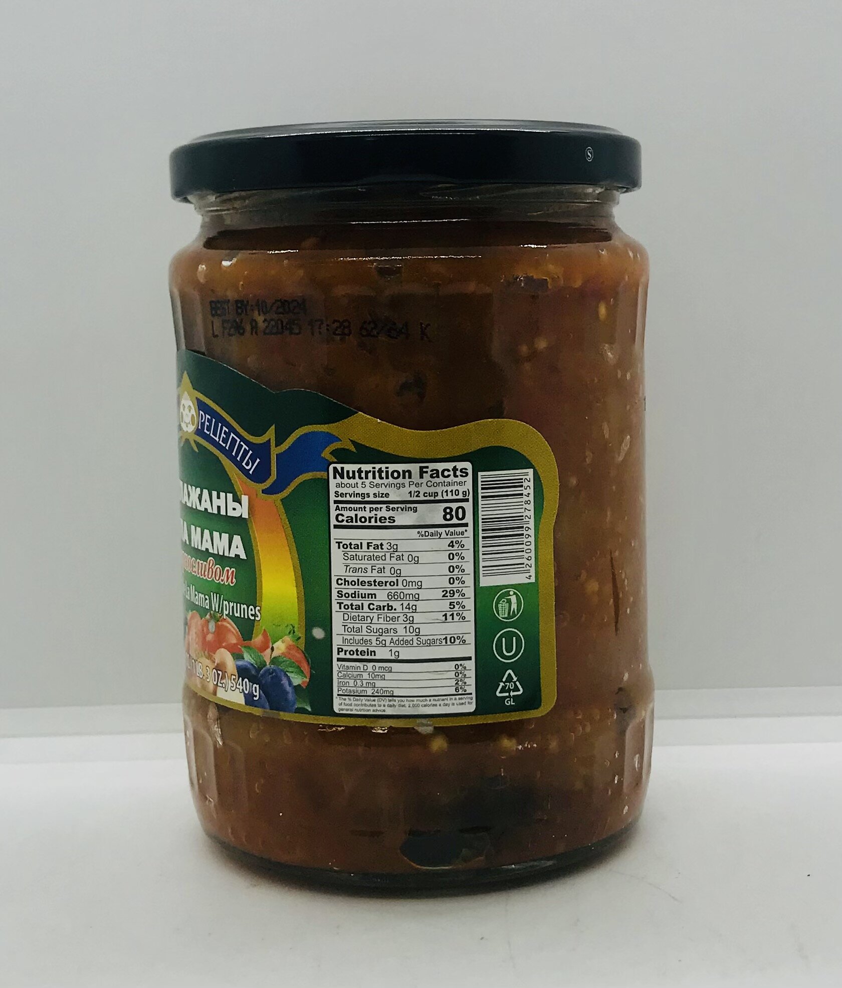Eggplant, water, tomato paste, carrots, peppers, sugar, dry prunes, onion, sunflower oil, salt, glucono delta-lactone.