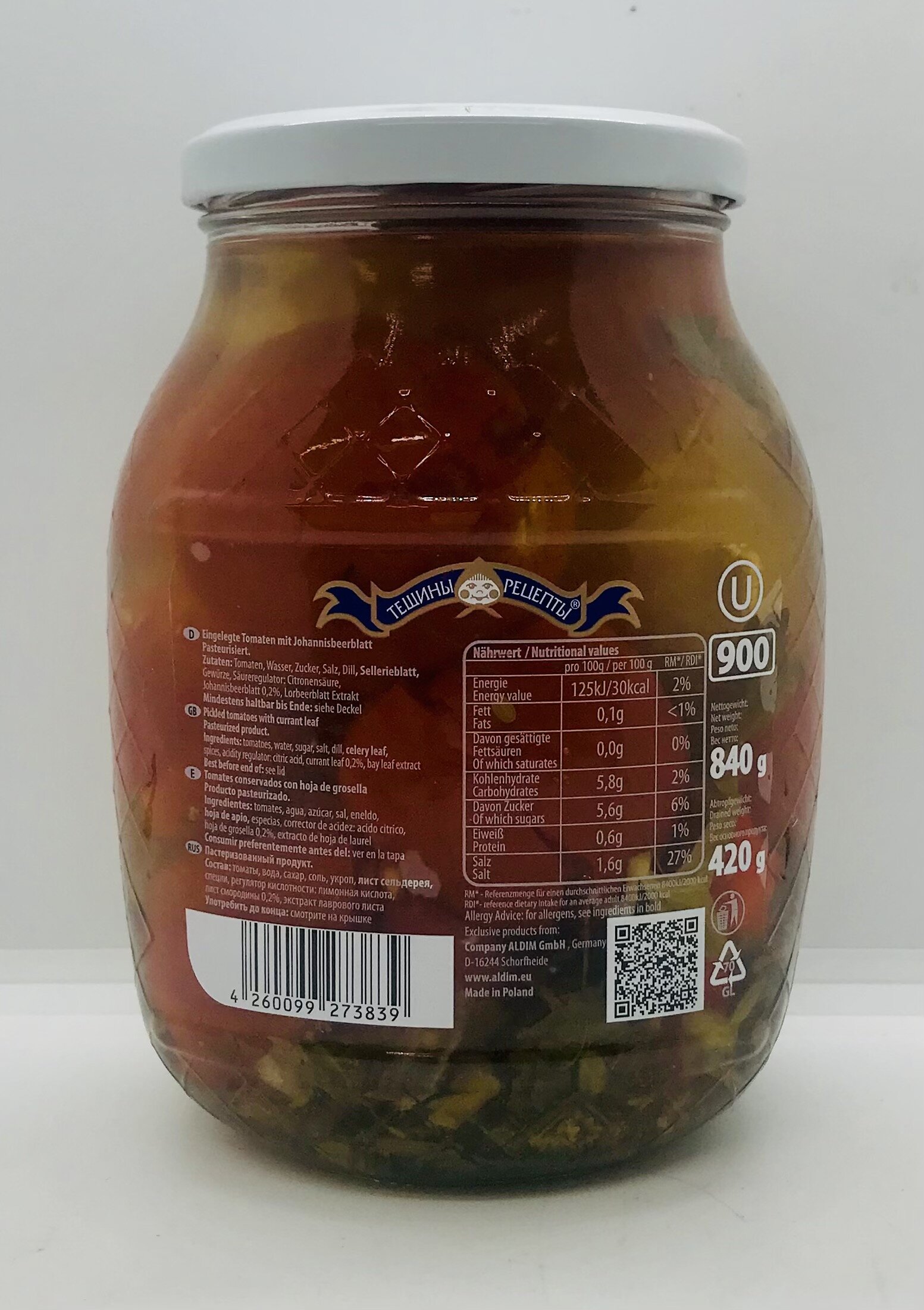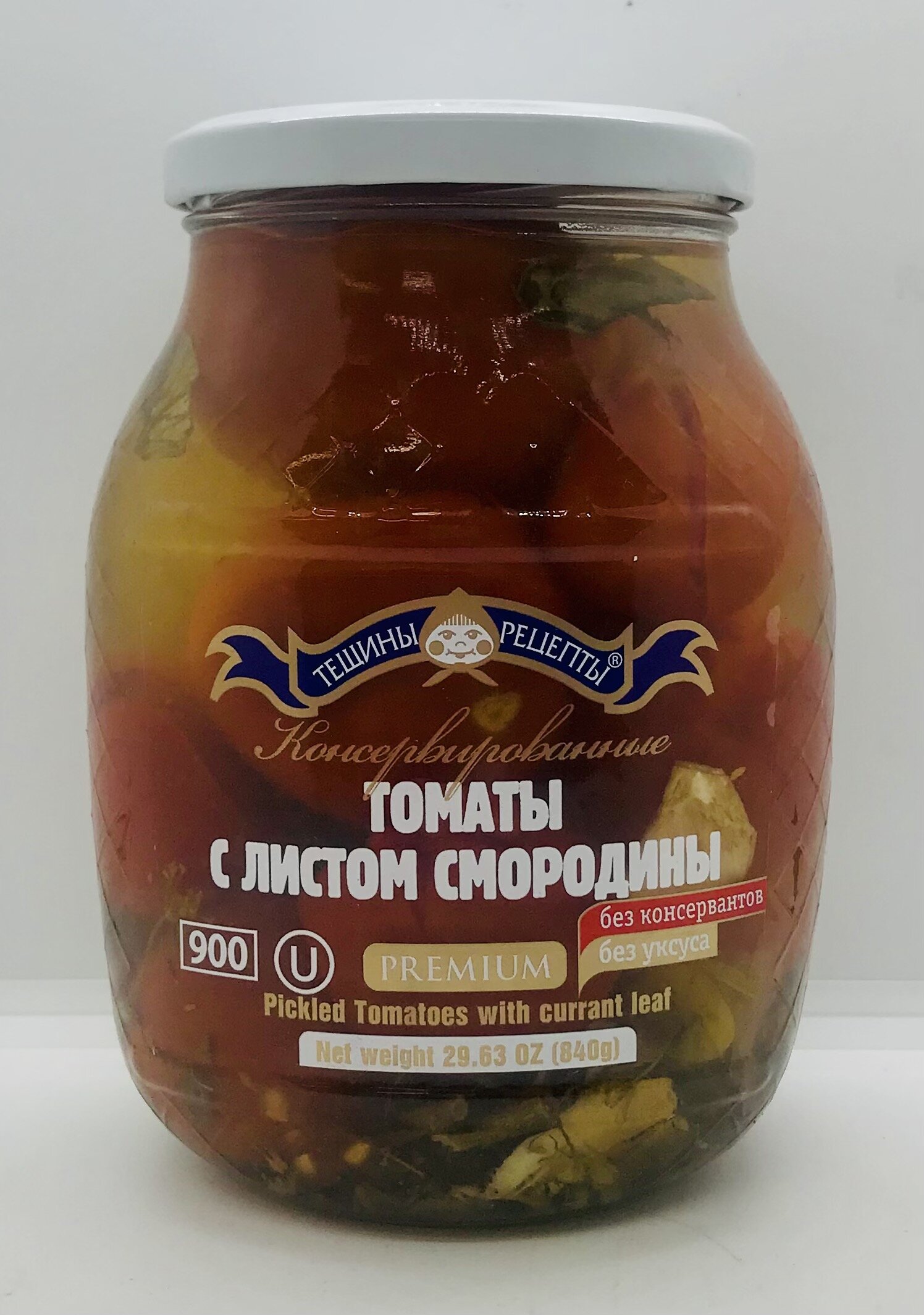 Tomatoes, water, sugar, salt, dill, celery leaf, spices, acidity regulator: citric acid, currant leaf 0.2%, bay leaf extract.