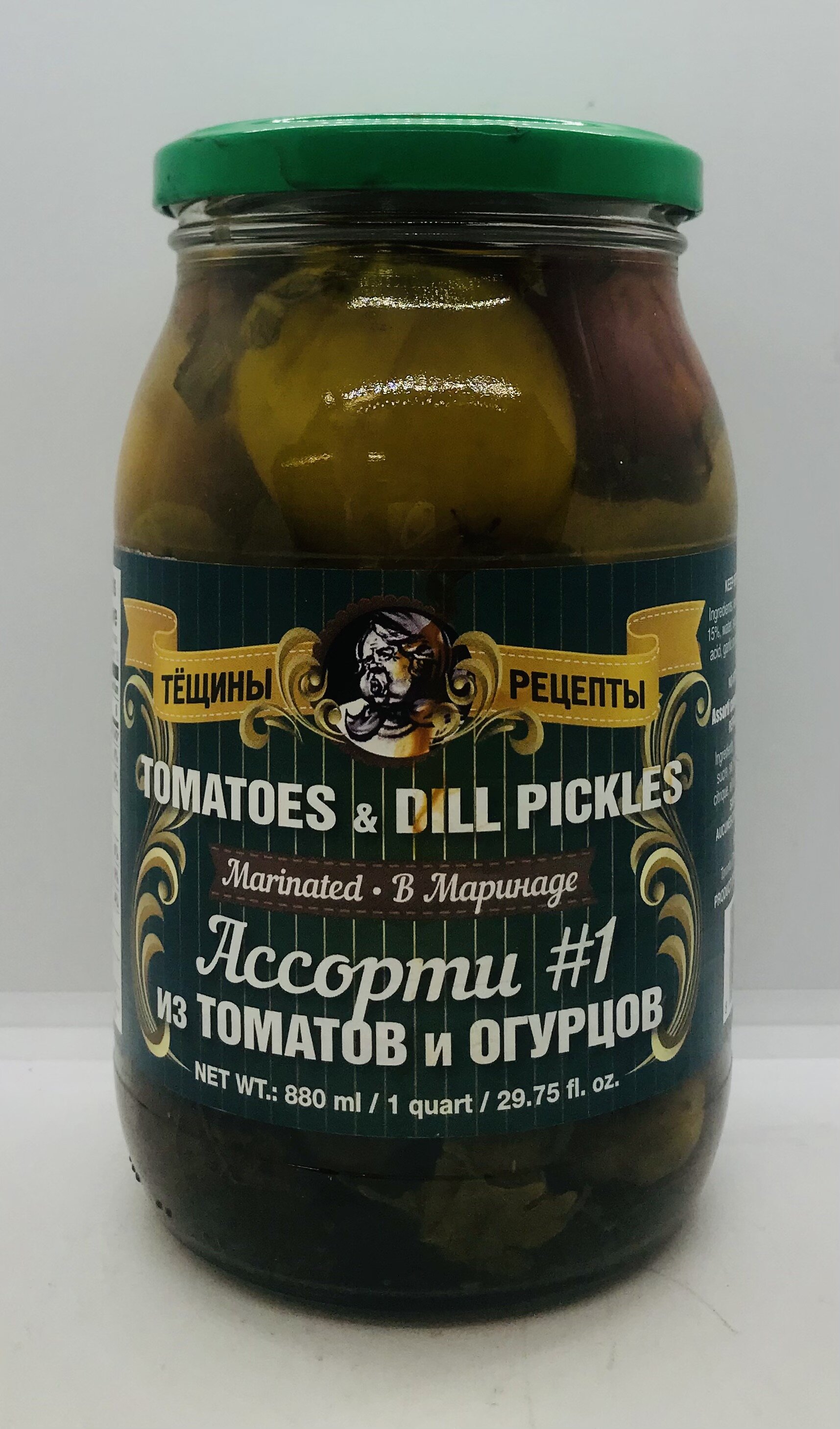 Red & Yellow tomatoes 35%, cucumbers 15%, water, sugar, salt, fresh herbs, acetic acid, citric acid, garlic or garlic extract, sweet pepper, bay leaf.