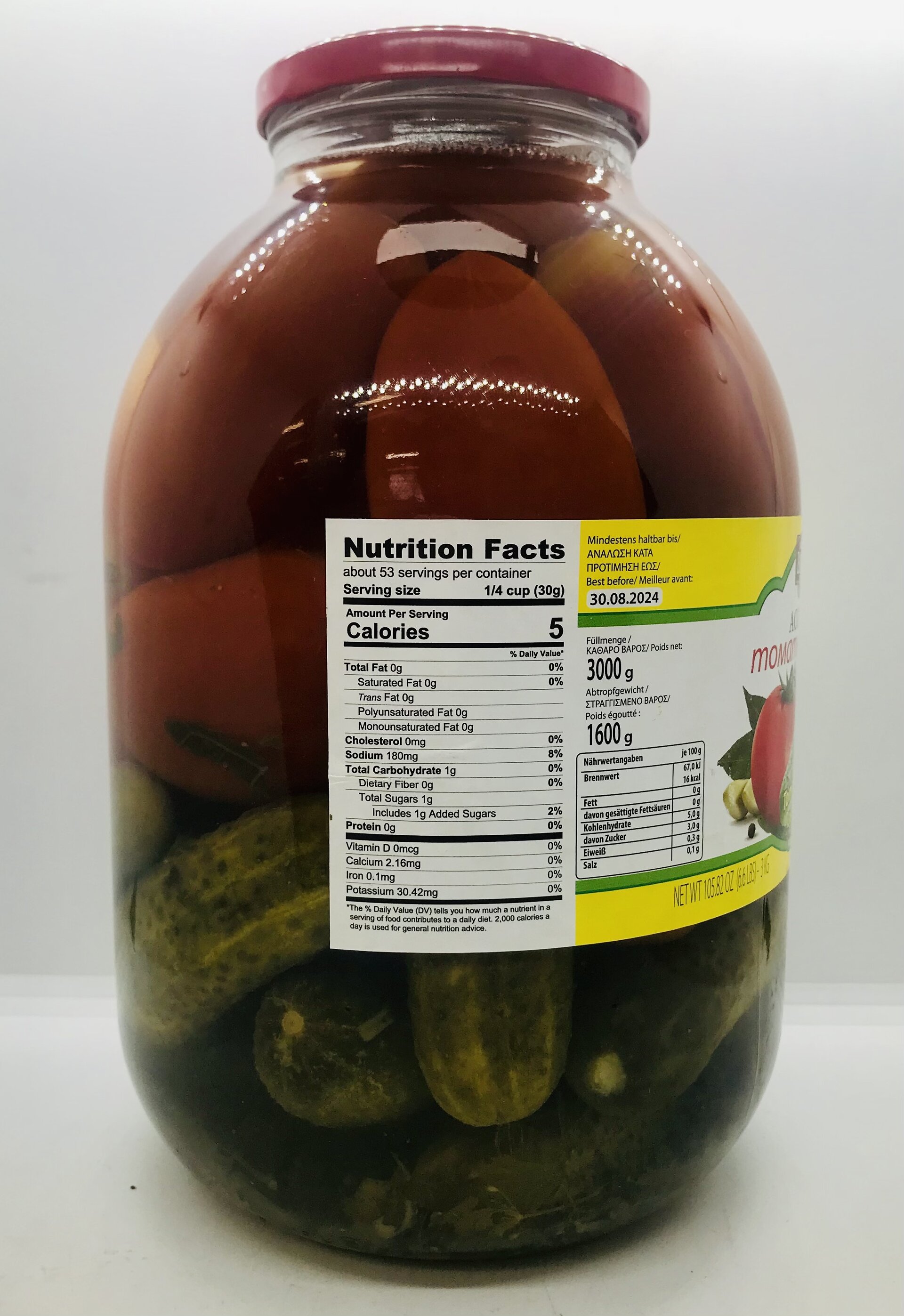 Tomatoes, water, cucumbers, sugar, salt, chili peppers, dill, horseradish, garlic, citric acid, distilled vinegar, parsley, black pepper, bay leaves, celery.