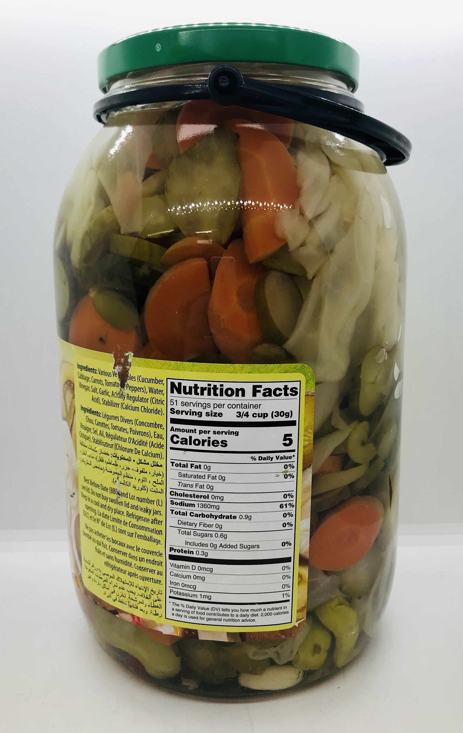 Various vegetables (cucumber, cabbage, carrots, tomato, peppers), water, vinegar, salt, garlic, acidity regulator (citric acid), stabilizer (calcium chloride).