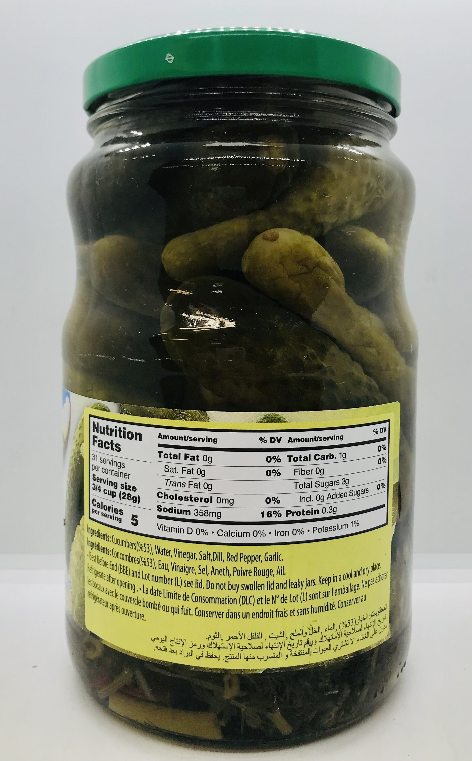 Cucumbers (53%), water, vinegar, salt, dill, red pepper, garlic.