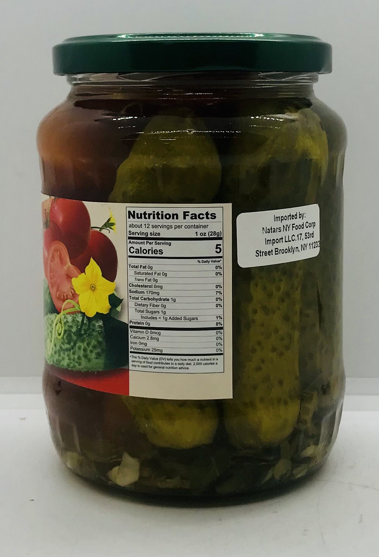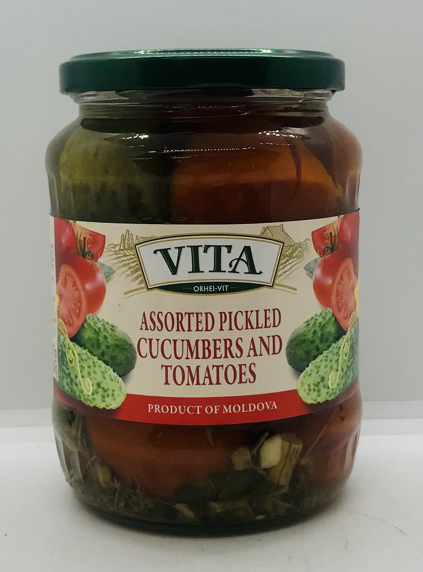 Cucumbers - 35%, tomatoes - 15%, sugar, salt, acidity regulator, acetic acid, green herbs, celery, garlic, spices.