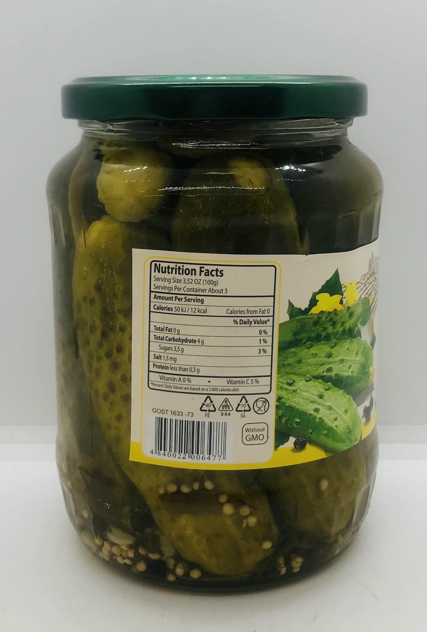 C ucumbers, water, herbs, garlic, spices, mustard seeds, sugar, salt, acidity regulator, acetic acid.