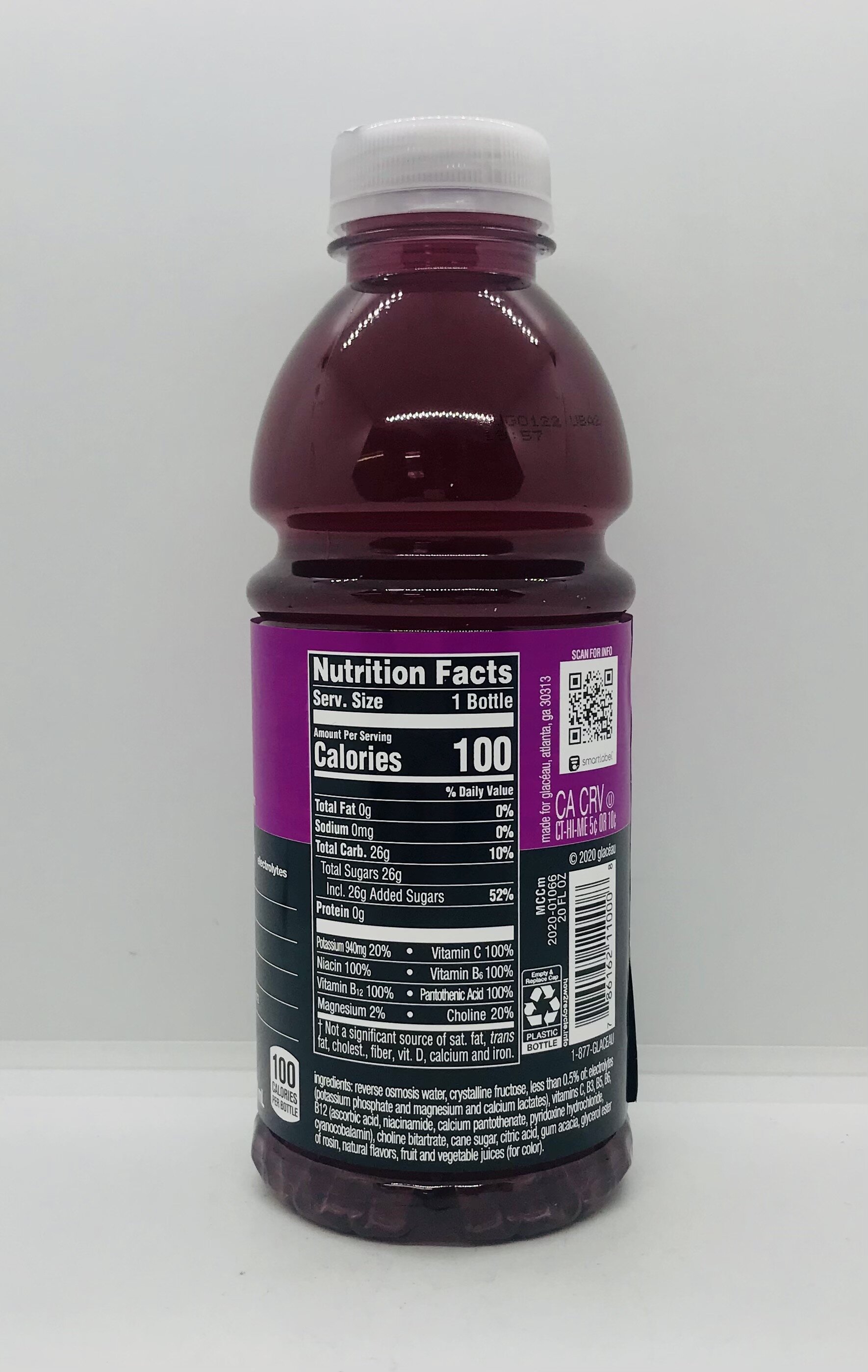 Reverse osmosis water, crystalline fructose, less than 0.5% of: electrolytes (potassium phosphate and magnesium and calcium lactates), vitamins C, B3, B5, B6, B12 (ascorbic acid, niacinamide, calcium pantothenate, pyridoxine hydrochloride, cyanocobalamin), choline bitartrate, cane sugar, citric acid, gum acacia, glycerol ester of rosin, natural flavors, fruit and vegetable juices (for color).