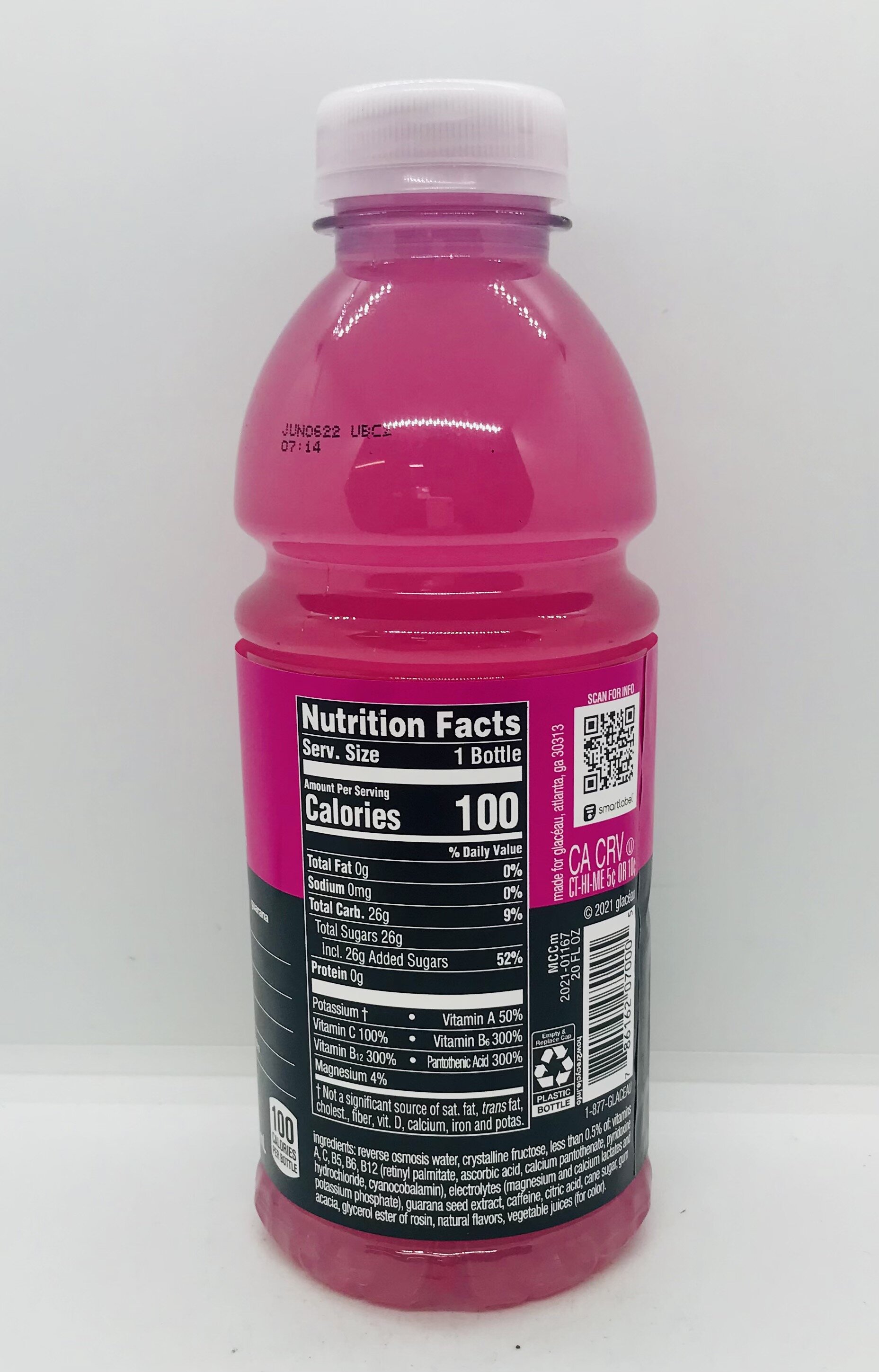 REVERSE OSMOSIS WATER, CRYSTALLINE FRUCTOSE, CANE SUGAR, LESS THAN 0.5% OF: CITRIC ACID, VITAMIN C (ASCORBIC ACID), NATURAL FLAVORS, VEGETABLE JUICE (COLOR), GUM ACACIA, MAGNESIUM LACTATE AND CALCIUM LACTATE AND POTASSIUM PHOSPHATE (ELECTROLYTE SOURCES), VITAMIN B5 (CALCIUM PANTOTHENATE), GLYCEROL ESTER OF ROSIN, VITAMIN A PALMITATE, VITAMIN B6 (PYRIDOXINE HYDROCHLORIDE), VITAMIN B12 (CYANOCOBALAMIN).