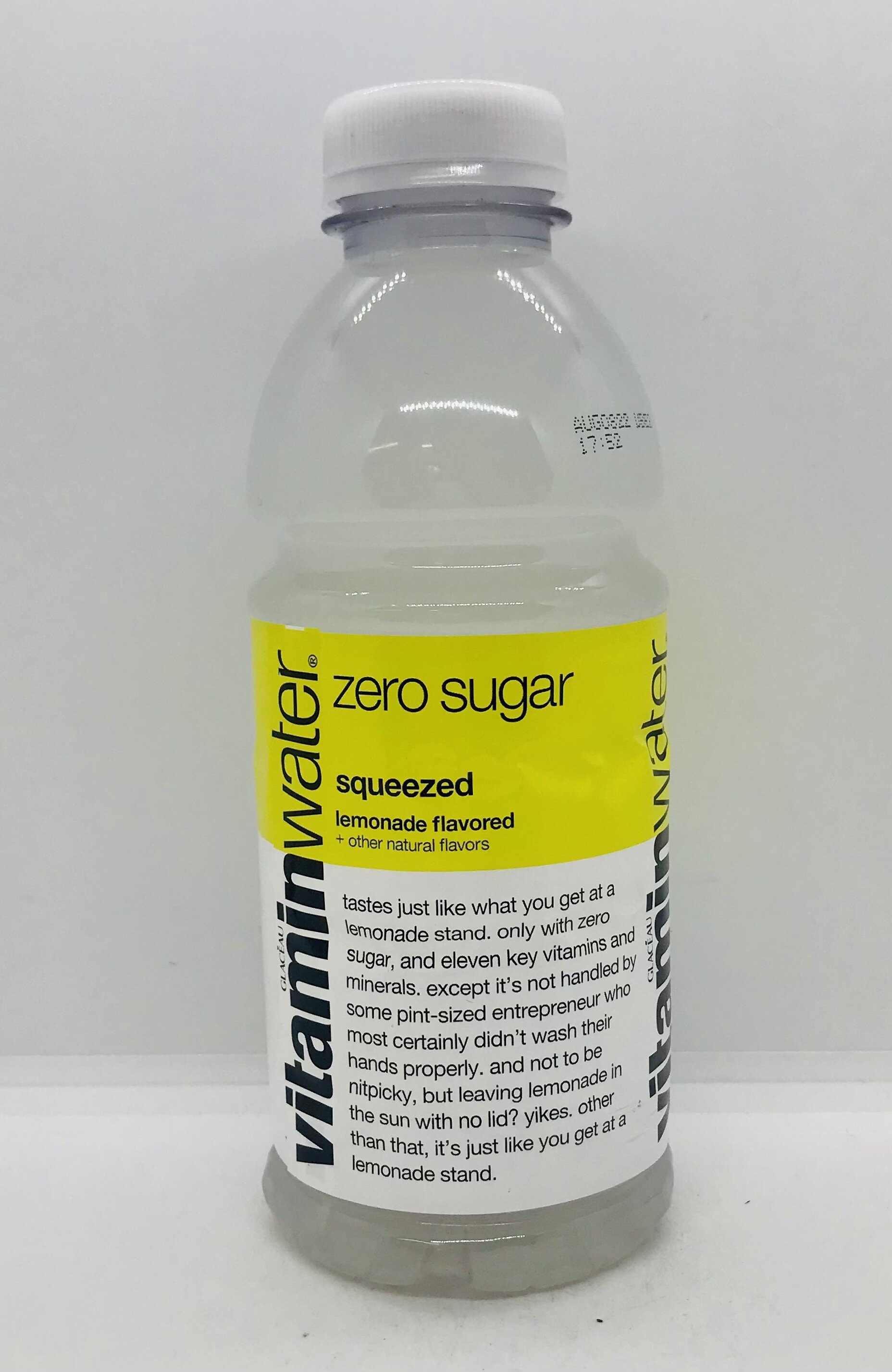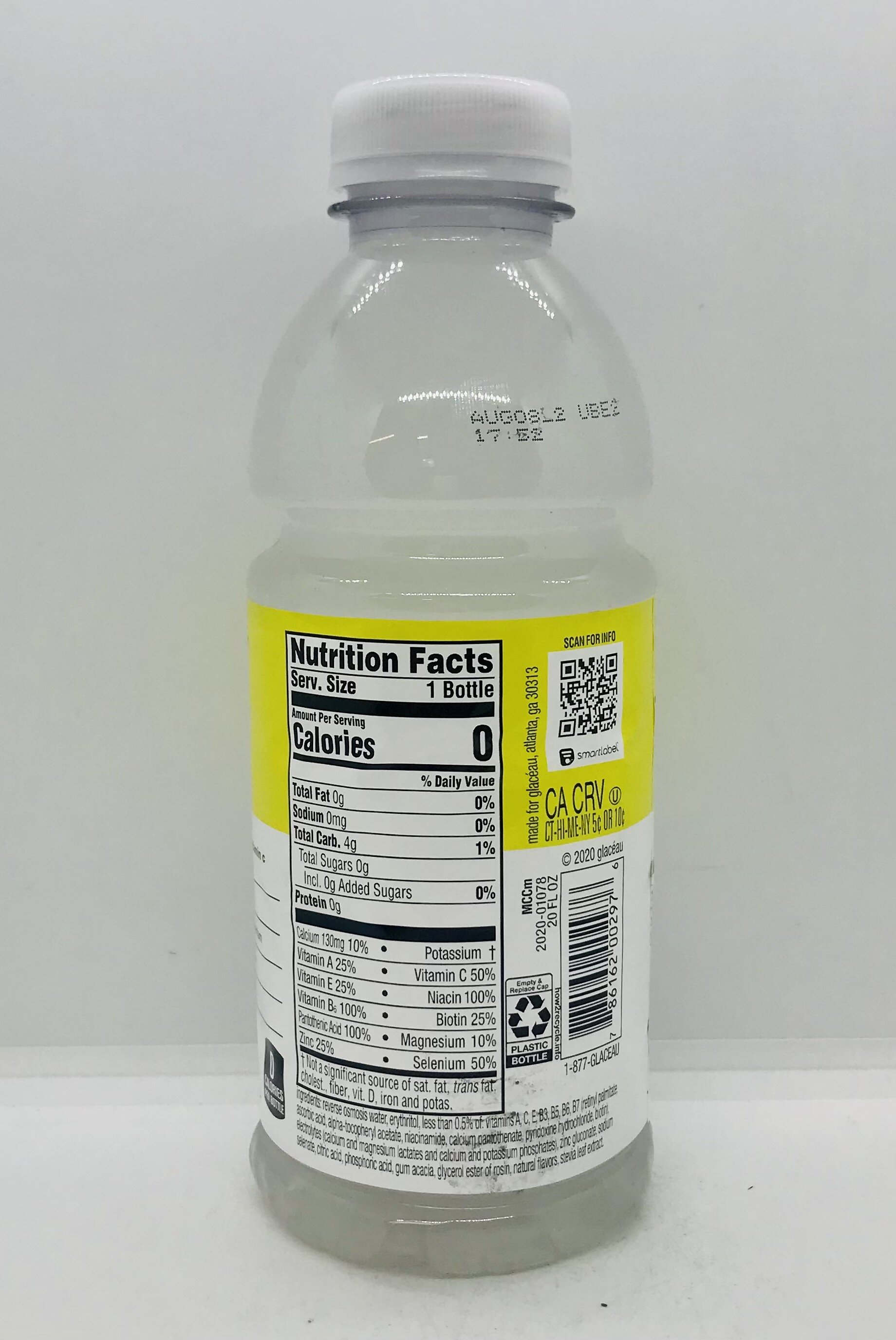 Reverse osmosis water, erythritol, less than 0.5% of: vitamins A, C, E, B3, B5, B6, B7 (retinyl palmitate, ascorbic acid, alpha-tocopherol acetate, niacinamide, calcium pantothenate, pyridoxine hydrochloride, biotin), electrolytes (calcium and magnesium lactates, calcium and potassium phosphates), zinc gluconate, sodium selenate, citric acid, phosphoric acid, gum acacia, glycerol ester of rosin, natural flavors, stevia leaf extract.