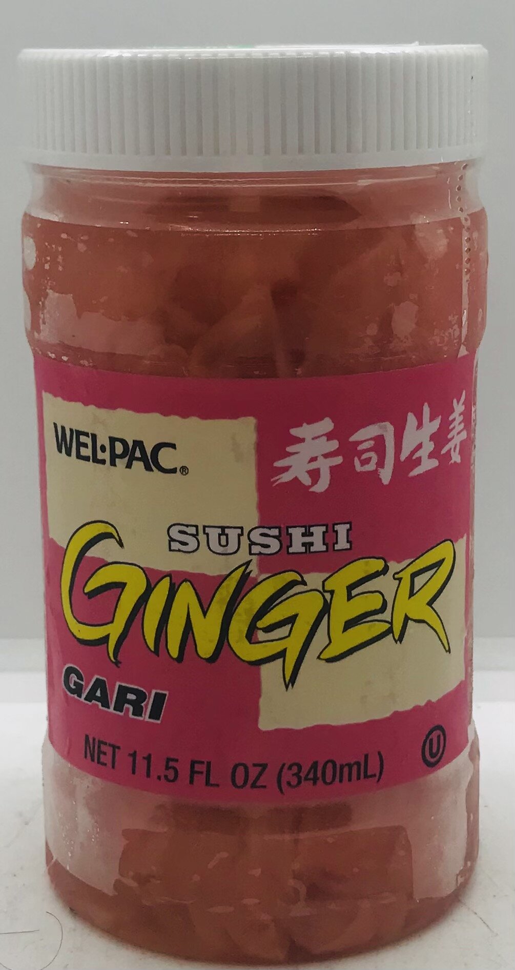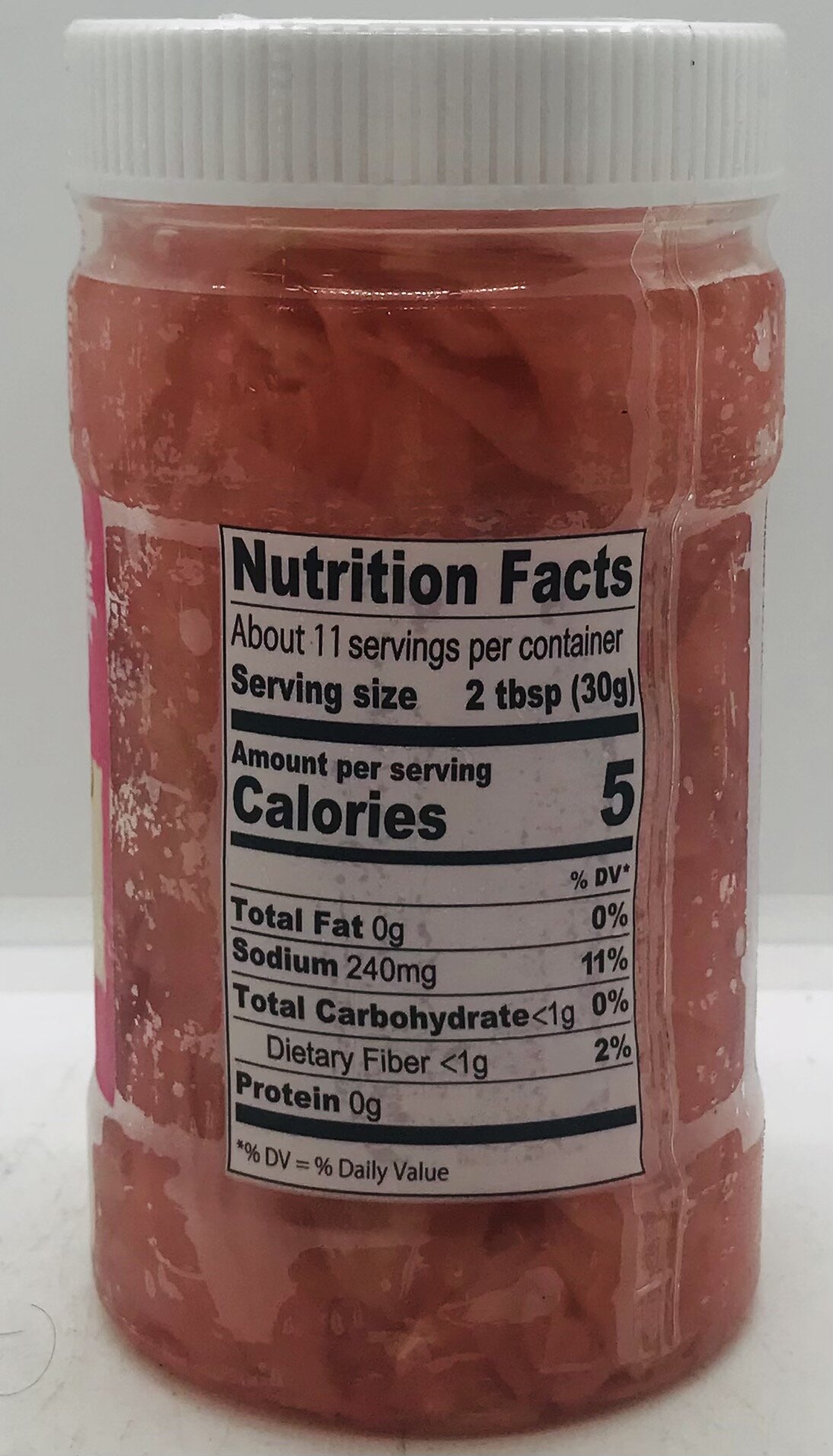 Ginger, water, salt, acetic, acid, citric, acid, aspartame, potassium sorbate (preservative), FD & C red no. 40.