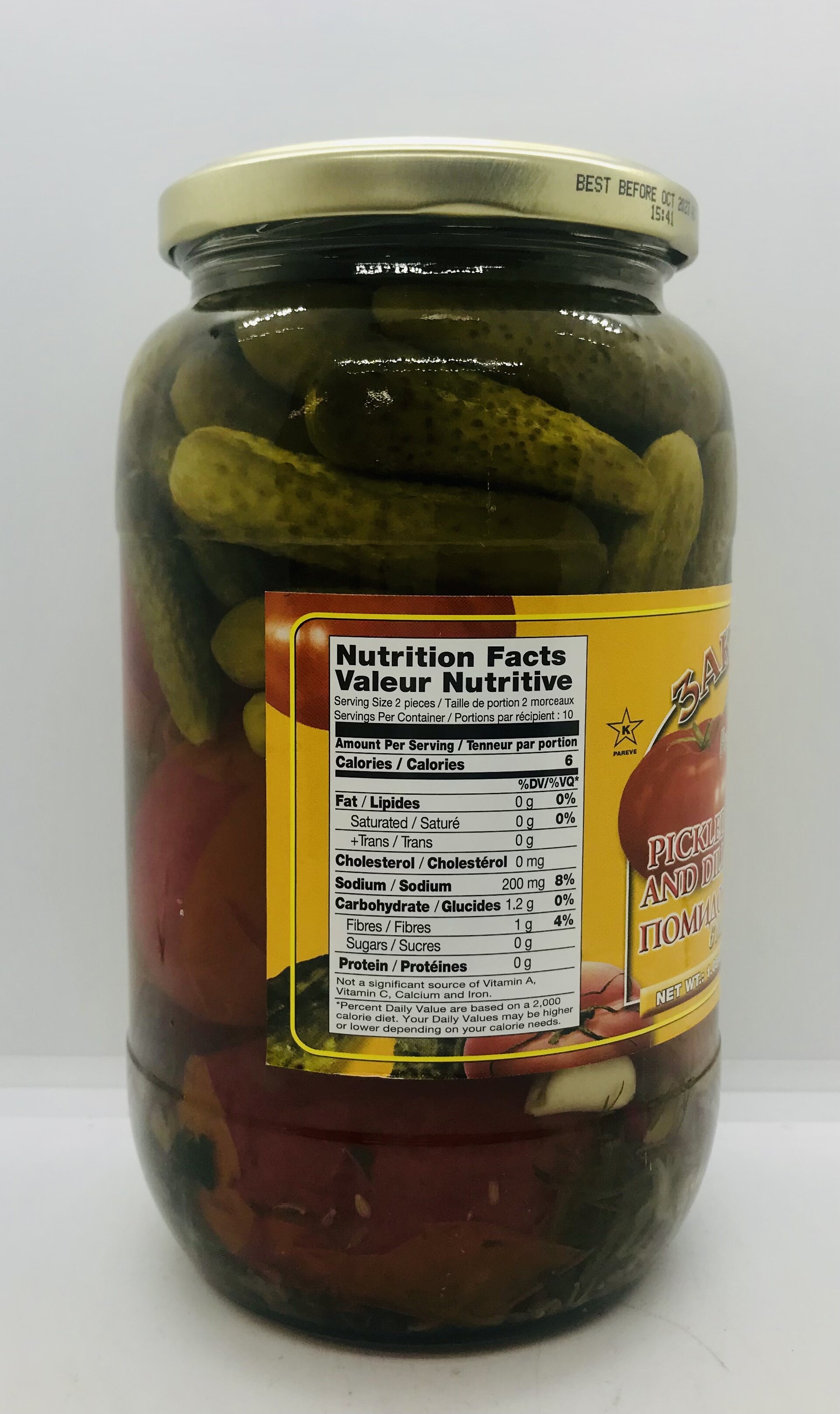Tomatoes and cucumbers, water, sugar, salt, spirit vinegar, natural spices.